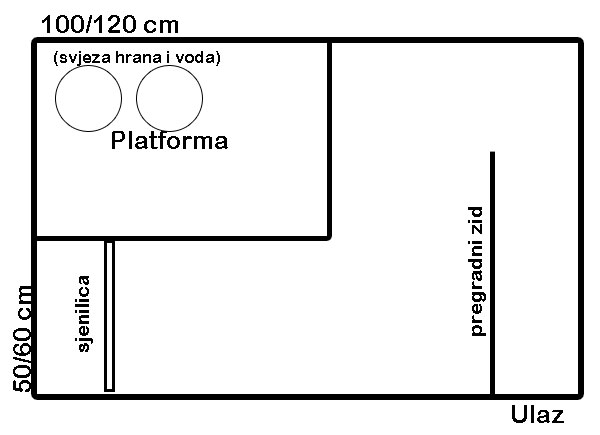 Vjetrovita strana prostora bi trebala biti zaštićena sa čvrstim zidom od drveta; na tom mjestu bi onda bio i dobar položaj za kućicu. Pri jakim kišama ili snijegu, potrebno je takvu nastambu djelomično prekriti sa ceradom.