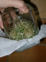 U staklenku napunjenu sjemenkama ili klicama se natoči voda, pričvrsti gore cjedilo i voda se kroz njega istoči iz staklenke. Zatim se staklenka ostavi da stoji koso kako bi višak vode mogao iscuriti.