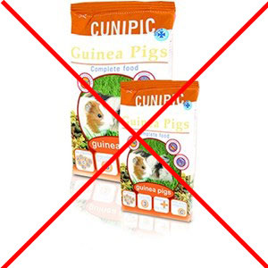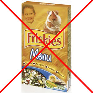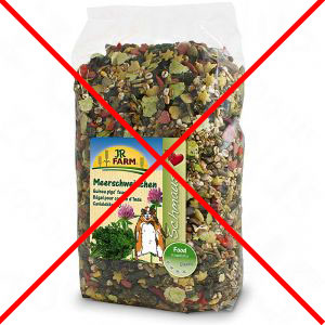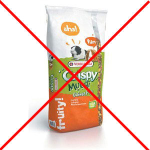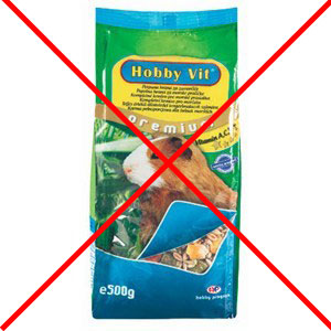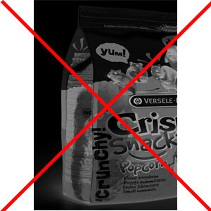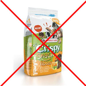 Neadekvatna, visokokalorična i visokoenergetska hrana, puna žitarica, melase, šećera, škroba, mekinja i sl.: (navedeni sastav iznad slika je sastav koji NIJE adekvatan za zamorčiće!)