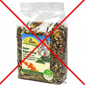 Nažalost nisu svi proizvođači spremni objaviti točan spisak sastava sadržaja, te se stoga ogradite i ne uzimajte one sorte kod kojih sadržaj i sastav nisu detaljno izlistani, pa čak i kad se te vrste hrane krase izjavama kao "bez žitarica" ili "bez šećera" - jer umjesto tih sirovina mogu biti dodane mnoge druge koje Vašim ljubimcima ne želite i ne bi trebali ponuditi. Proizvođači hrane su obavezni navesti protein, masnoće, pepeo i sirova vlakna - sve ostalo im je dano na volju da navedu ili ne, a najčešće nije potpuno. Skoro u svim gotovim hranama se može naći lucerna, žitarice, melasa (otpad prilikom proizvodnje šećera koja se najvećim djelom sastoji iz šećera!) i ostali sastojci, koje Vašoj životinji nikada ne bi dali, da nije prešana u šarene kuglice, kružiće ili štapiće. Nemojte se dati zavarati od zelenih sastojaka, često sadrže peleti koji su zeleni, samo mali postotak sijena ili mirodijskih biljaka, najčešće se sastoje od žitarica, melase, umjetnih boja i ostalih sastojaka koje Vaše životinje uopće ne trebaju!