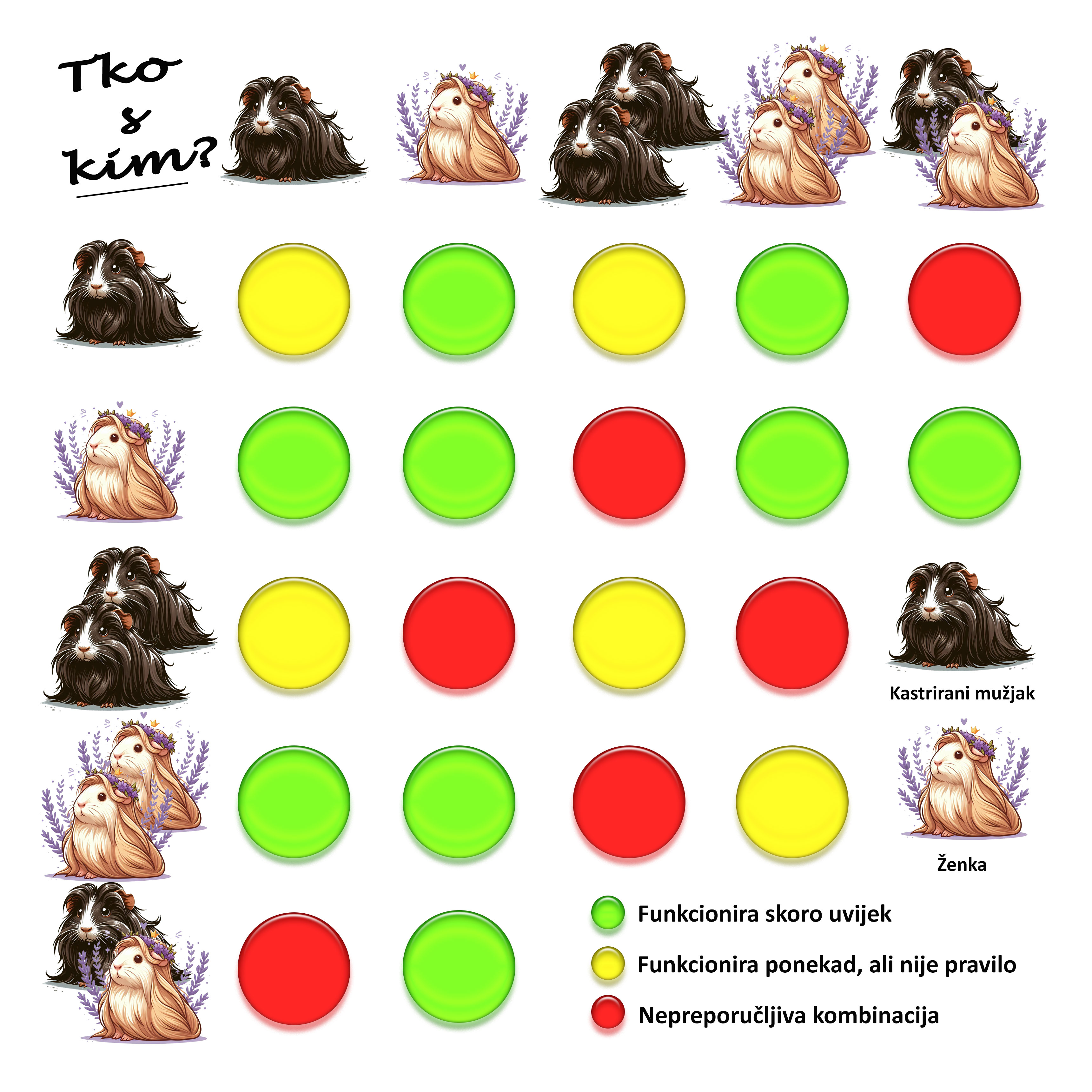 Nemojte nikada združiti jednog zamorčića sa kunićem ili nekom drugom životinjom - svaki priča svoj jezik i ne mogu nikada jedan drugom zamijeniti društvo iste vrste - naprovit, mogu si nanijeti štete, kako psihološke tako i fizičke naravi.