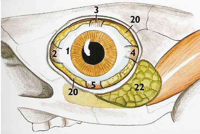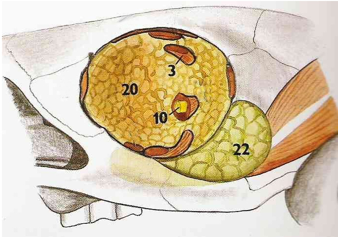 U očnoj se šupljini nalazi očna jabučica (1) i njena muskulatura (2-5), žlijezda slinovnica (gl. zygomatica, 20), suzna žlijezda (gl. lacrimalis, 22), kao i očni živci (n. opticus, 10) i krvni sudovi. Alveole gornjih kutnjaka su samo međuzidom, tankim kao papir, odvojeni od očne šupljine (slike: Popesko et al.: Colouer Atlas of Anatomy of Small Laboratory Animals, W.B. Saunders Ltd.; prosinac 2002). |